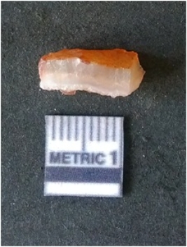 | Description / विवरण | The quartz fragment shows prominent flaks scars and sharp flaked ends as a result of flaking. The piece is translucent white and shows cryptocrystalline matrix. |