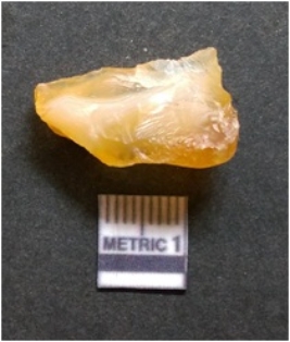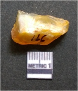 | Description / विवरण | It is chalcedony flake, translucent in appearance. The piece shows sharp pointed ends and flake scars on the surface as a result of flaking. The piece shows a bulb of percussion. |