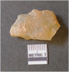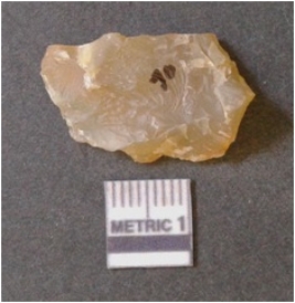 | Description / विवरण | It is chalcedony flake, translucent in appearance. The piece shows sharp pointed ends and flake scars on the surface as a result of flaking. The piece shows a bulb of percussion. |