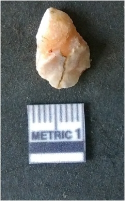 | Description / विवरण | The quartz fragment shows prominent flaks scars and sharp flaked ends as a result of flaking. The piece is translucent white and shows cryptocrystalline matrix. |