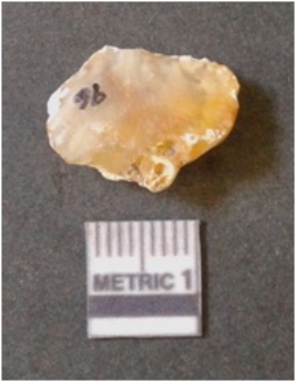 | Description / विवरण | It is chalcedony flake, translucent in appearance. The piece shows sharp pointed ends and flake scars on the surface as a result of flaking. The piece shows a bulb of percussion. |