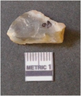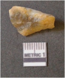 | Description / विवरण | The flake has irregular fracture pattern and sharp flaked edges as a result of lithic knapping activity. The piece is pale, with surfacial flake scars and a bulbous end. The flake is of smoky quartz variety, grayish in colour and translucent in appearance. |