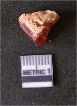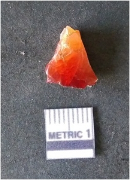| Description / विवरण | It is carnelian flake, with sharp flakes edges and a small bulb of percussion owing to knapping activity. |