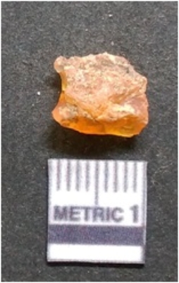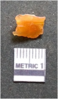 | Description / विवरण | It is chalcedony flake, translucent in appearance. The piece shows sharp pointed ends and flake scars on the surface as a result of flaking. The piece shows a bulb of percussion. |