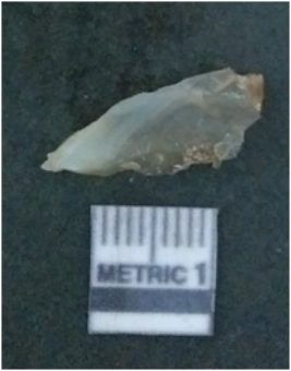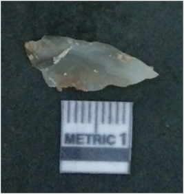 | Description / विवरण | It is chalcedony flake, translucent in appearance. The piece shows sharp pointed ends and flake scars on the surface as a result of flaking. The piece shows a bulb of percussion. |