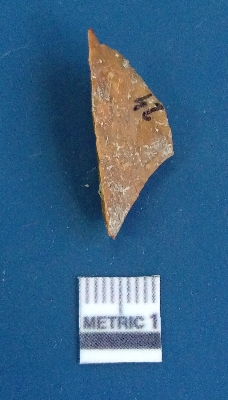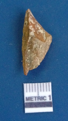 | Description / विवरण | The chert piece is dark in color, with a prominent bulb of percussion and sharp flaked edges. The piece is a part of lithic debitage or raw material for lithic knapping. The piece shows clear ripple marks and bulb of percussion. |