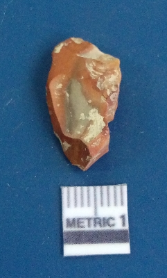 | Description / विवरण | The chert piece is dark in color, with a prominent bulb of percussion and sharp flaked edges. The piece is a part of lithic debitage or raw material for lithic knapping. The piece shows clear ripple marks and bulb of percussion. |