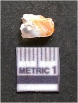 | Description / विवरण | The quartz flake has sharp flaked edges and pointed ends as a result of flaking. The piece is semi-transparent in nature with irregular fracture pattern. The piece is roughly triangular in shape and has a prominent bulb of percussion. |