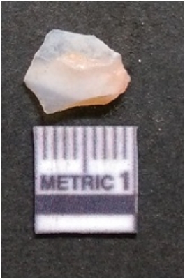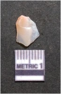 | Description / विवरण | The quartz flake has sharp flaked edges and pointed ends as a result of flaking. The piece is semi-transparent in nature with irregular fracture pattern. The piece is roughly triangular in shape and has a prominent bulb of percussion. |