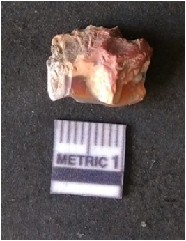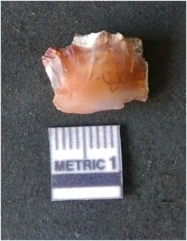 | Description / विवरण | It is carnelian flake, with sharp flakes edges and a small bulb of percussion owing to knapping activity. |