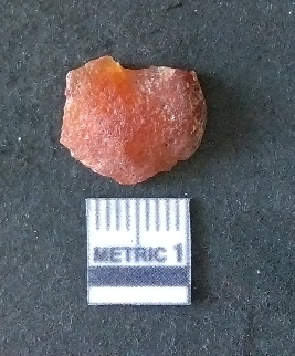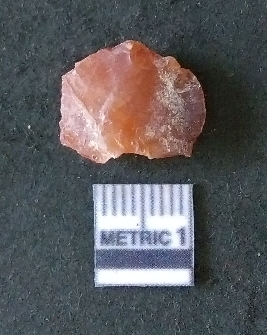 | Description / विवरण | The carnelian flake is reddish in color, with sharp flakes edges and a small bulb of percussion owing to knapping activity. |