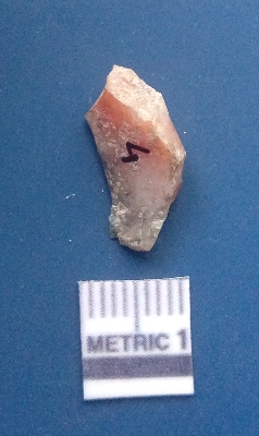 | Description / विवरण | The quartz flake has sharp flaked edges and pointed ends as a result of flaking. The piece is semi-transparent in nature with irregular fracture pattern. The piece is roughly triangular in shape and has a prominent bulb of percussion. |