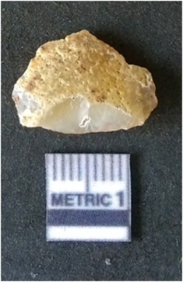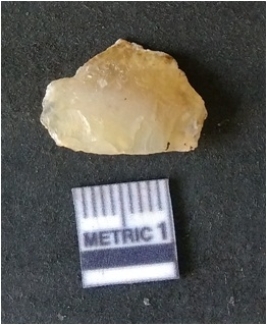 | Description / विवरण | It is chalcedony flake, translucent in appearance. The piece shows sharp pointed ends and flake scars on the surface as a result of flaking. The piece shows a bulb of percussion. |