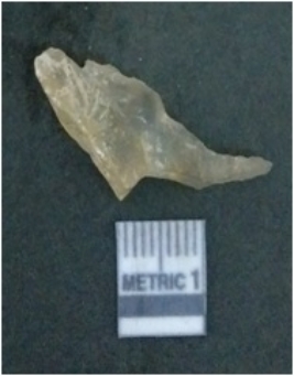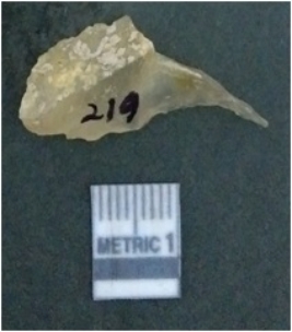 | Description / विवरण | It is chalcedony flake, translucent in appearance. The piece shows sharp pointed ends and flake scars on the surface as a result of flaking. The piece shows a bulb of percussion. |
