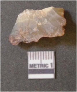 | Description / विवरण | The banded agate piece is crystalline in nature, with a smooth fracture pattern and visible bands on the flaked sides. The piece is pale in color and has sharp flaked ends. |