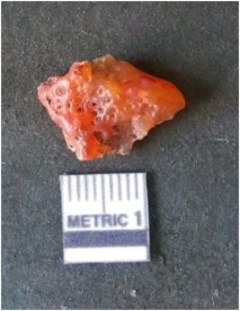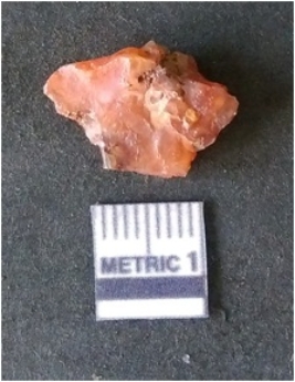 | Description / विवरण | It is carnelian flake red in color, with sharp flakes edges and a small bulb of percussion owing to knapping activity. The piece has sharp flaked edges and a crypto-crystalline matrix. |