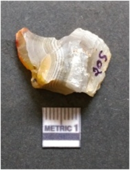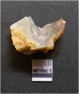 | Description / विवरण | The flake has irregular fracture pattern and sharp flaked edges as a result of lithic knapping activity. The piece is pale, with surfacial flake scars and a bulbous end. The flake is of smoky quartz variety, grayish in colour and translucent in appearance. |