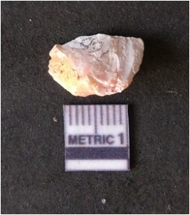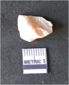 | Description / विवरण | The quartz flake has sharp flaked edges and pointed ends as a result of flaking. The piece is semi-transparent in nature with irregular fracture pattern. The piece is roughly triangular in shape and has a prominent bulb of percussion. |
