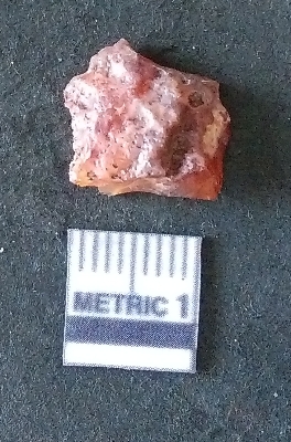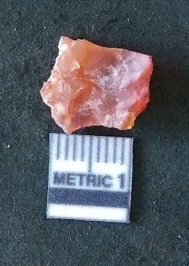 | Description / विवरण | The carnelian flake is reddish in color, with sharp flakes edges and a small bulb of percussion owing to knapping activity. |