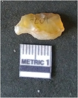 | Description / विवरण | It is chalcedony flake, translucent in appearance. The piece shows sharp pointed ends and flake scars on the surface as a result of flaking. The piece shows a bulb of percussion. |