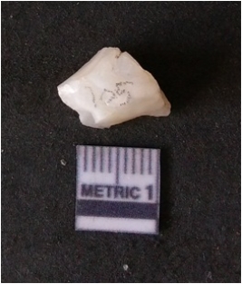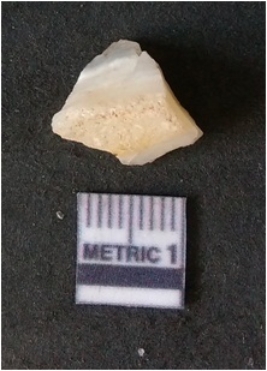 | Description / विवरण | The quartz flake has sharp flaked edges and pointed ends as a result of flaking. The piece is semi-transparent in nature with irregular fracture pattern. The piece is roughly triangular in shape and has a prominent bulb of percussion. |