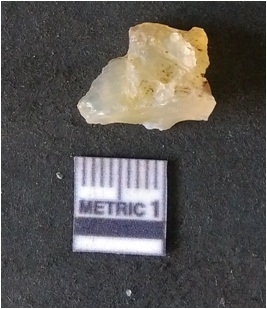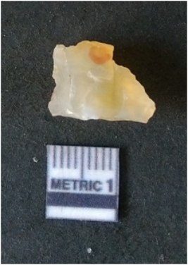 | Description / विवरण | It is chalcedony flake, translucent in appearance. The piece shows sharp pointed ends and flake scars on the surface as a result of flaking. The piece shows a bulb of percussion. |