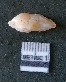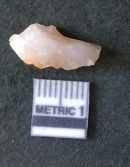 | Description / विवरण | The quartz fragment shows prominent flaks scars and sharp flaked ends as a result of flaking. The piece is translucent white and shows cryptocrystalline matrix. |