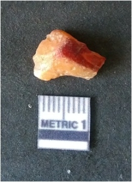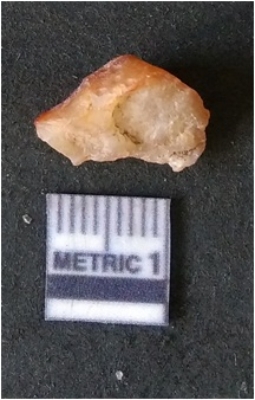 | Description / विवरण | It is chalcedony flake, translucent in appearance. The piece shows sharp pointed ends and flake scars on the surface as a result of flaking. The piece shows a bulb of percussion. |