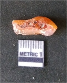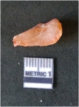 | Description / विवरण | It is chalcedony flake, translucent in appearance. The piece shows sharp pointed ends and flake scars on the surface as a result of flaking. The piece shows a bulb of percussion. |