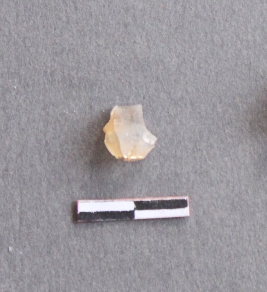 | Description / विवरण | This is a small fragment of chalcedony with bulb of percussion prominent, flaked edges. A small fragment of calcium deposit on one edge point, transparent. |