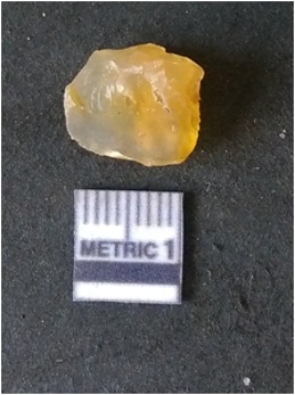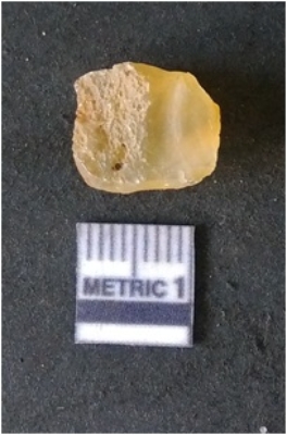 | Description / विवरण | It is chalcedony flake, translucent in appearance. The piece shows sharp pointed ends and flake scars on the surface as a result of flaking. The piece shows a bulb of percussion. |