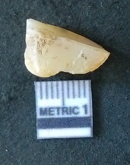 | Description / विवरण | The quartz fragment shows prominent flaks scars and sharp flaked ends as a result of flaking. The piece is translucent white and shows cryptocrystalline matrix. |
