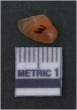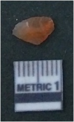 | Description / विवरण | It is carnelian flake red in color, with sharp flakes edges and a small bulb of percussion owing to knapping activity. The piece has sharp flaked edges and a crypto-crystalline matrix. |