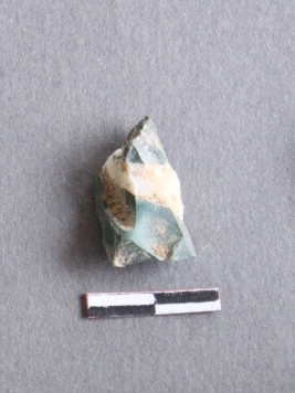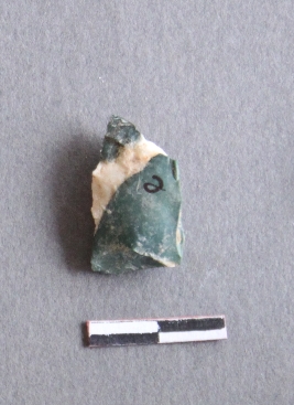 | Description / विवरण | Jasper green with white crystalline band, bulb of percussion can be seen, sharp edges with cut ridges. |
