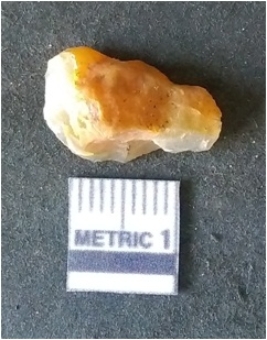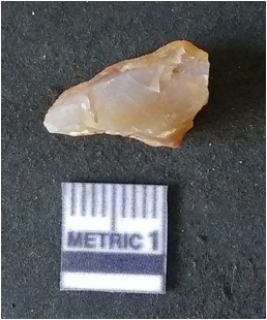 | Description / विवरण | It is chalcedony flake, translucent in appearance. The piece shows sharp pointed ends and flake scars on the surface as a result of flaking. The piece shows a bulb of percussion. |