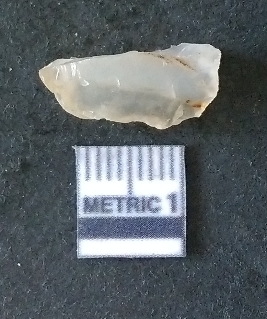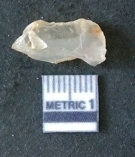 | Description / विवरण | The quartz fragment shows prominent flaks scars and sharp flaked ends as a result of flaking. The piece is translucent white and shows cryptocrystalline matrix. |