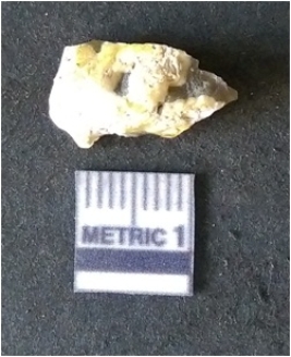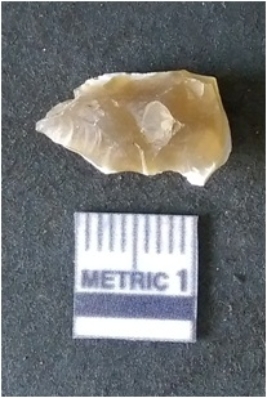 | Description / विवरण | The smoky quartz flake has sharp flaked edges and pointed ends as a result of flaking. The piece is semi-transparent in nature with irregular fracture pattern. The piece is roughly triangular in shape and has a prominent bulb of percussion. |