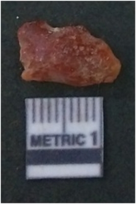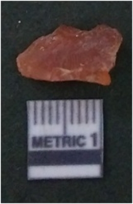 | Description / विवरण | It is carnelian flake red in color, with sharp flakes edges and a small bulb of percussion owing to knapping activity. The piece has sharp flaked edges and a crypto-crystalline matrix. |