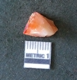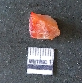 | Description / विवरण | The carnelian flake is reddish in color, with sharp flakes edges and a small bulb of percussion owing to knapping activity. |