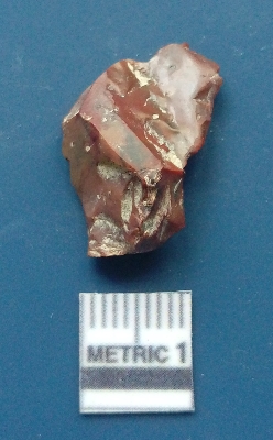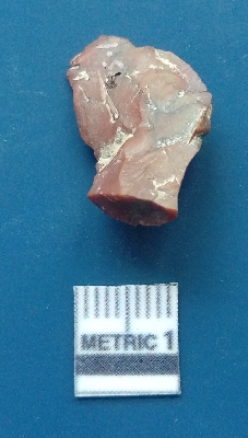 | Description / विवरण | It is a flake. The ridges and the flake scars are clearly seen on the dorsal surface while the ventral surface is plain. The lateral sides are sharp and it is dark reddish in colour. |