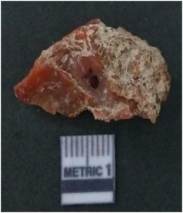 | Description / विवरण | It is carnelian flake red in color, with sharp flakes edges and a small bulb of percussion owing to knapping activity. The piece has sharp flaked edges and a crypto-crystalline matrix. |