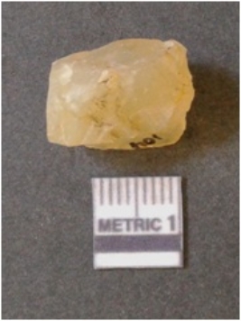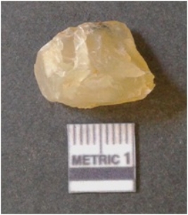| Description / विवरण | It is chalcedony flake, translucent in appearance. The piece shows sharp pointed ends and flake scars on the surface as a result of flaking. The piece shows a bulb of percussion. |