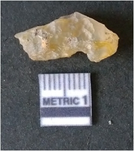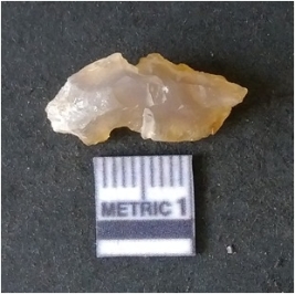 | Description / विवरण | It is chalcedony flake, translucent in appearance. The piece shows sharp pointed ends and flake scars on the surface as a result of flaking. The piece shows a bulb of percussion. |