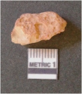 | Description / विवरण | It is chalcedony flake, translucent in appearance. The piece shows sharp pointed ends and flake scars on the surface as a result of flaking. The piece shows a bulb of percussion. |