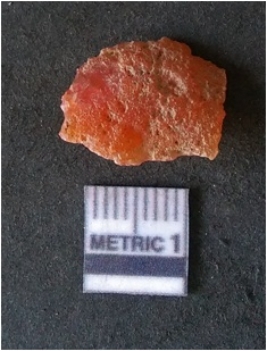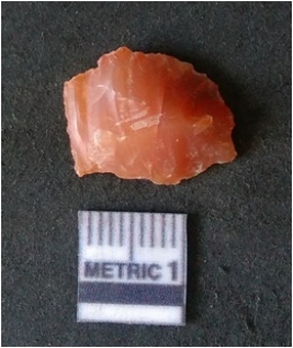 | Description / विवरण | It is carnelian flake red in color, with sharp flakes edges and a small bulb of percussion owing to knapping activity. The piece has sharp flaked edges and a crypto-crystalline matrix. |