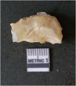 | Description / विवरण | The quartz flake has sharp flaked edges and pointed ends as a result of flaking. The piece is semi-transparent in nature with irregular fracture pattern. The piece is roughly triangular in shape and has a prominent bulb of percussion. |