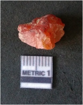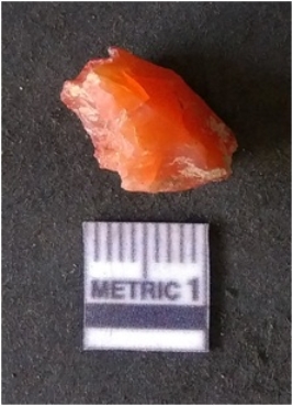 | Description / विवरण | It is carnelian flake red in color, with sharp flakes edges and a small bulb of percussion owing to knapping activity. The piece has sharp flaked edges and a crypto-crystalline matrix. |