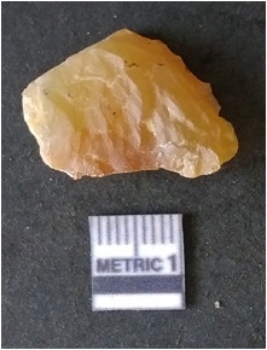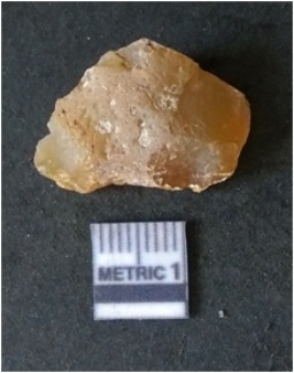 | Description / विवरण | It is chalcedony flake, translucent in appearance. The piece shows sharp pointed ends and flake scars on the surface as a result of flaking. The piece shows a bulb of percussion. |