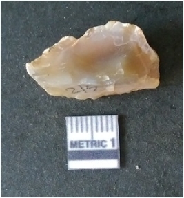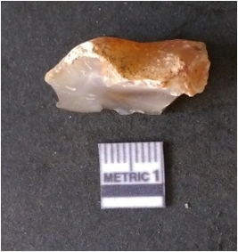 | Description / विवरण | It is chalcedony flake, translucent in appearance. The piece shows sharp pointed ends and flake scars on the surface as a result of flaking. The piece shows a bulb of percussion. |