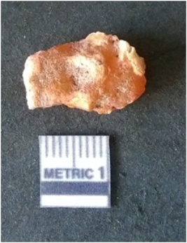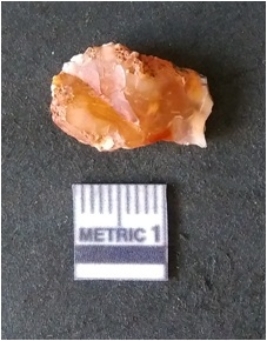 | Description / विवरण | It is chalcedony flake, translucent in appearance. The piece shows sharp pointed ends and flake scars on the surface as a result of flaking. The piece shows a bulb of percussion. |